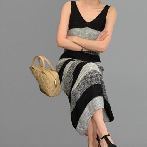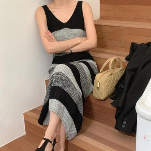 [신상오픈런]여성 배색 단가라 브이넥 트임 나시 니트 롱 원피스