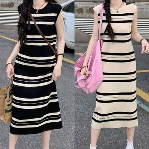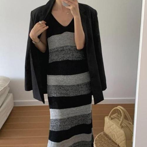 [신상오픈런]여성 브이넥 스트라이프 배색 롱 나시 니트 원피스