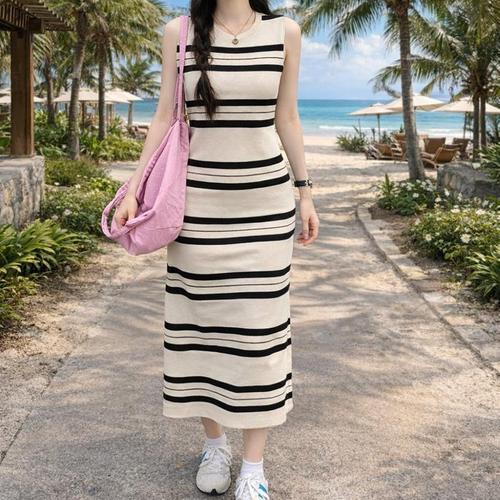 [옷자락] 여성 슬림핏 라운드넥 스트라이프 민소매 니트 미디 원피스