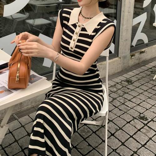 [무드수]스트라이프 슬림 폴로 민소매 롱 데일리 원피스