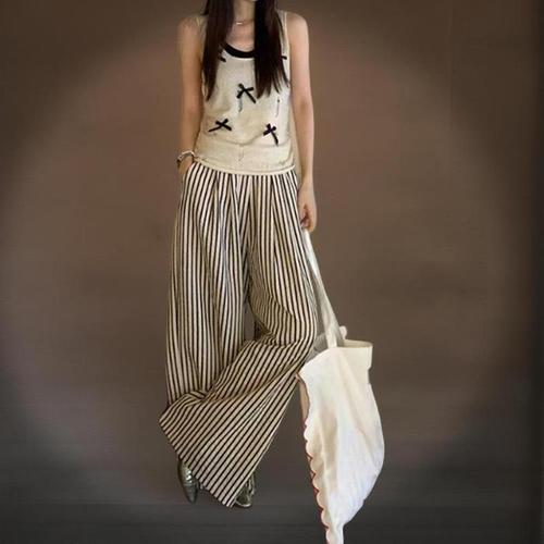 [신상오픈런]여성 리본 나시 슬림핏 스트라이프 팬츠 세트 (44659826)