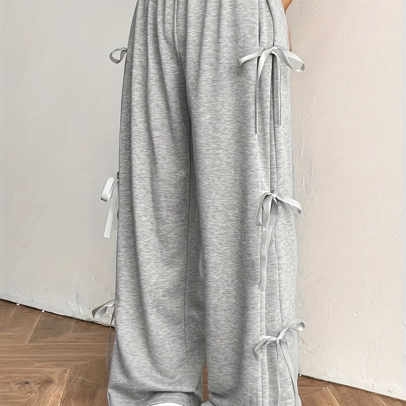 TEMU 플러스 사이즈 여성용 캐주얼 슬랙스, 리본 장식 - 사계절용 레그 디자인, 매일 착용 가능한 솔리드 컬러 바지