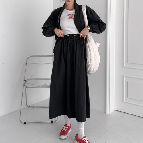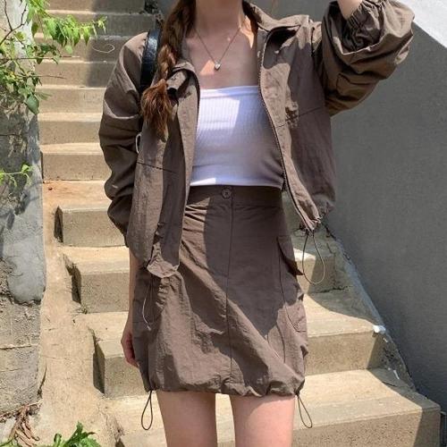 큐니티 여성 아노락 바스락 바람막이 크롭자켓 + 카고 롱 스커트 상하의 세트 투피스 치마