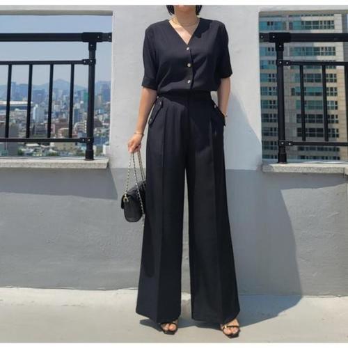 [바이어스]브이넥 블라우스 스판 와이드 슬랙스 바지 세트 코디 (15240512)