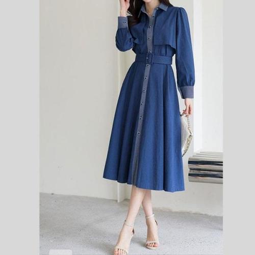[바이어스]플레어 A라인 카라넥 배색 트렌치 프릴 롱 원피스 룩 (15032261)