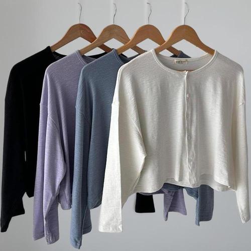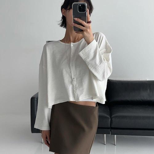 [옷자락]여자 잔골지 라운드넥 크롭 롱슬리브 박스핏 가디건