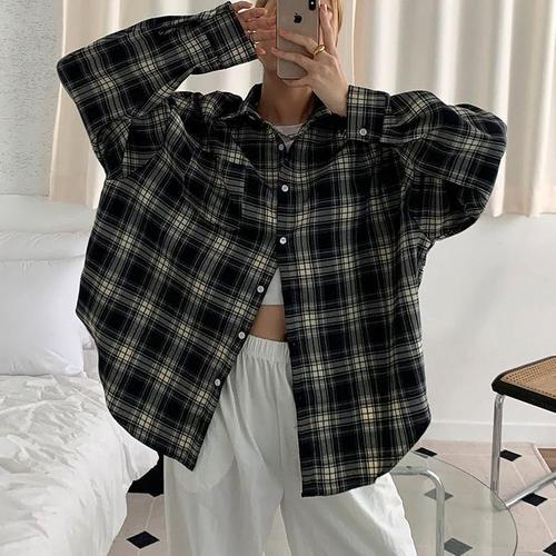 [다잇템]여자 격자 박스 롱슬리브 박시핏 빅사이즈 셔츠 (10846546A)