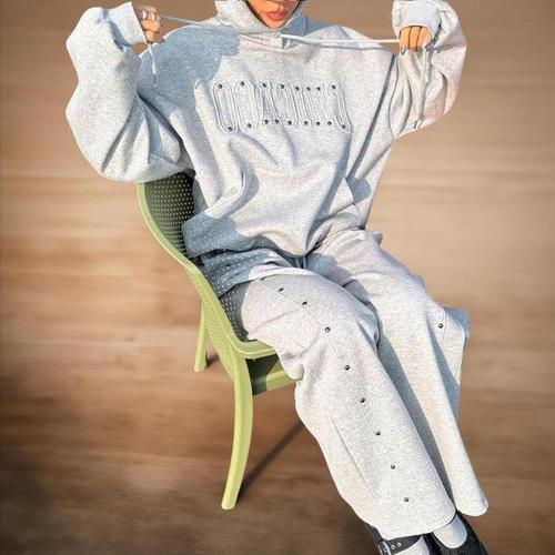 [신상오픈런]여성 후드티와 리벳 팬츠 세트, 박시 레터링 디자인 (44659883)