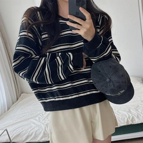 [하프클럽/옷자락]여자 스트라이프 봄 대학생 배색 브이넥 박시 맨투맨