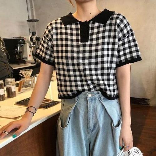 [엄지척]여자 반크롭 스타일 카라 니트 체크 고품질 1P 여름_19807005_667501