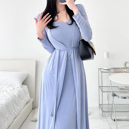 [옷자락]여자 SS 부드러운 30대 U넥 롱원피스 카디건 반소매 세트