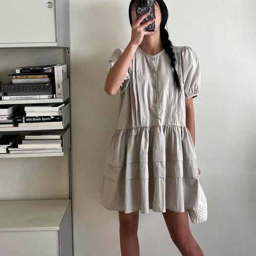 [다잇템]여자 벌룬반팔 티어드 단추 SS 미니원피스 (15257856A)
