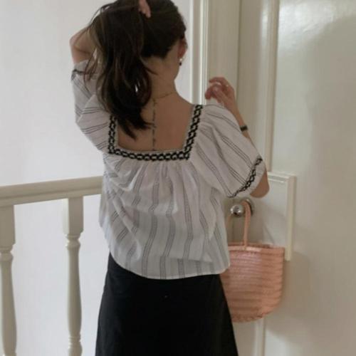 여성 여름 데일리 스퀘어넥 자수 반팔 블라우스 (WFHQHUQ)