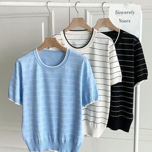 [다잇템]여자 U넥 미니멀리즘 줄무늬 반소매 펀칭 니트