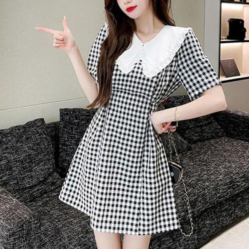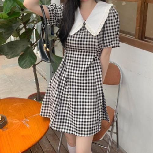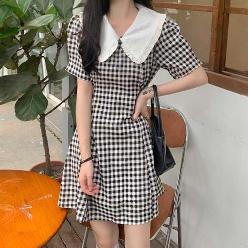 [셀러허브_여성트랜드패션]ONM 여성 미니원피스 반팔 체크무늬 러블리 롱카라 여름