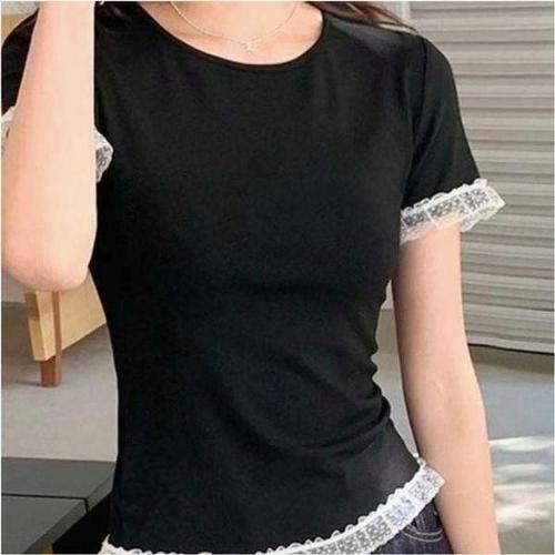 [셀러허브_여성트랜드패션]여성 슬림핏 여름티셔츠 2컬러 여성티셔츠 레이스 여름 반팔티셔츠 라운드넥