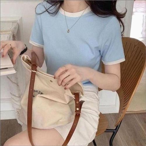 [셀러허브_여성트랜드패션]여자 배색 골지 슬림핏 깔끔한 3컬러 여름 반팔티셔츠