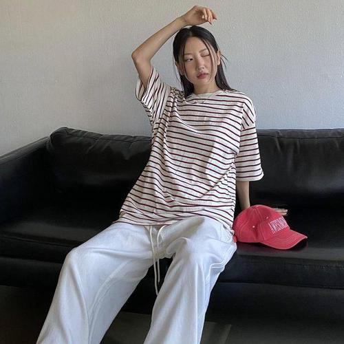 [옷자락]여자 코튼 스트라이프 라운드넥 루즈핏 반팔티