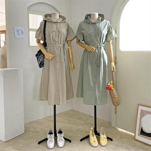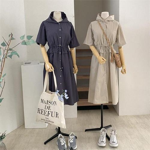 [다잇템]여자 후디 잔주름 버튼업 반소매 고무줄 원피스 (9988473A)