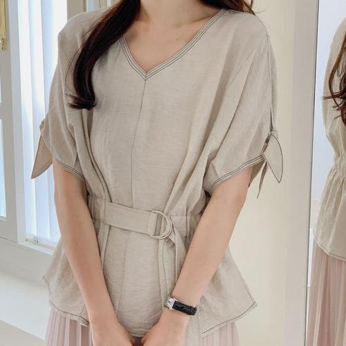 [다잇템][다잇템] 여자 고무줄 리본반팔 린넨블라우스 혁대 V넥 블라우스_17156783_588872