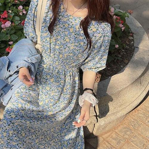 [오너클랜]인기상품 여성용 여름 코튼 플라워 프린트 롱 반팔 원피스 스퀘어넥 디자인 [WFLL7JG_260304]