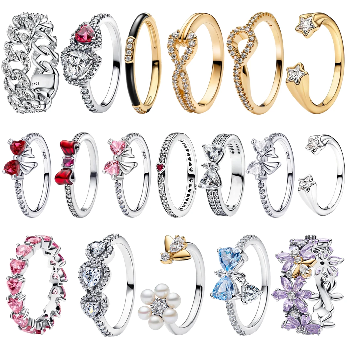 원래 925 스털링 실버 반지 사랑 심장 위시 본 문 태양 반지 크리스탈 로즈 골드 여성을위한 결혼 선물 럭셔리 쥬얼리