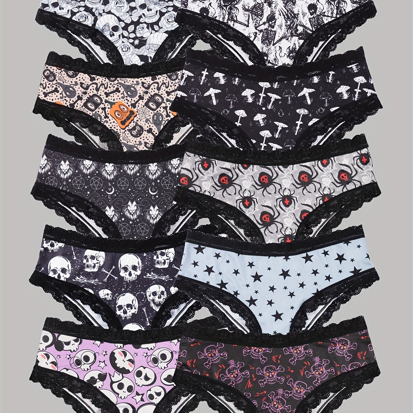 TEMU 10개 여성용 섹시 귀여운 고딕 시크 로우라이즈 팬티 - 대비 레이스, 전체 할로윈 프린트, 편안한 힙스터 팬티 - 할로윈 란제리 & 속옷 - 편안함, 다양한 스타일, 특별한 날이나 일상 착용을 위한 완벽한 선물 아이디어, 섹시한 스타일