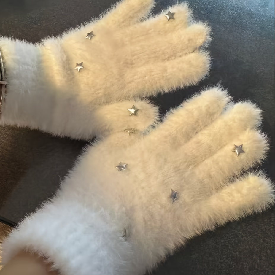 TEMU 1쌍 여성용 별무늬 보온 플러시 겨울 장갑 - 전체 손가락 두꺼운 보온 장갑, 스키, 운전, 야외 활동, 추운 날씨 및 크리스마스 선물용 - 학생들을 위한 포근한 겨울 , 손세탁 가능
