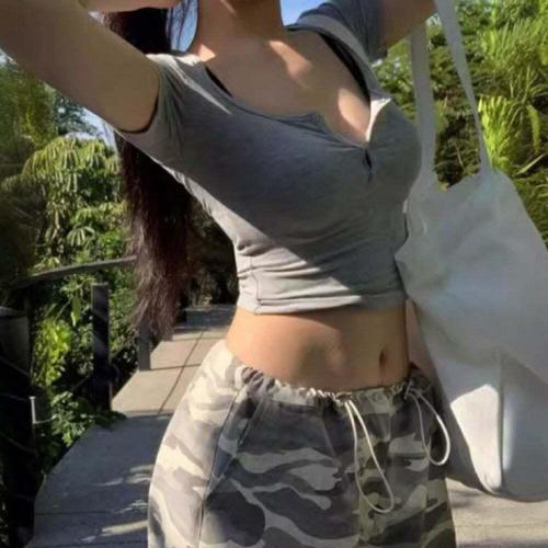 버튼 크롭 여성 U넥 티셔츠 배꼽티 슬림핏 반팔 여름