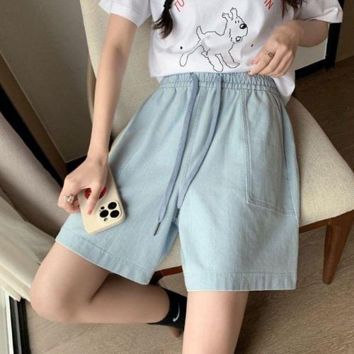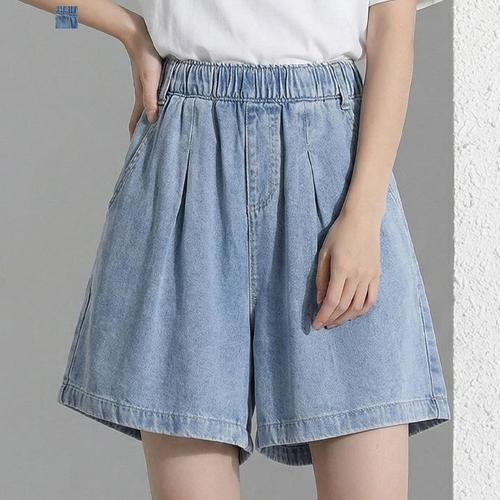 여성용 와이드 밴딩 버뮤다 데님 팬츠 데일리 여름 청 반바지 댓데님5부밴딩팬츠