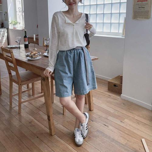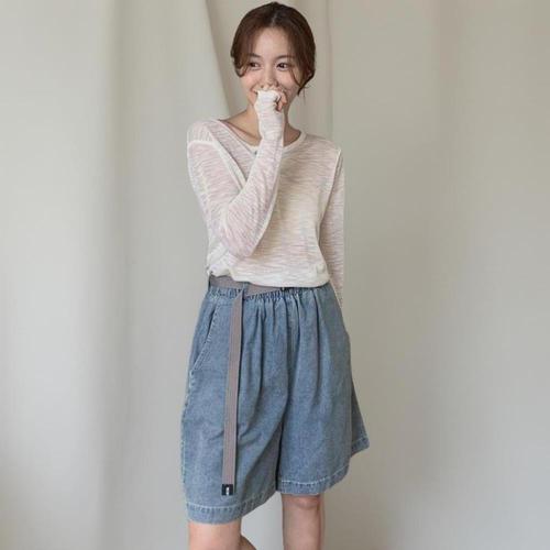 |CHP8CCA|여성용 코튼 벨트 데님 와이드 반바지 밴딩 숏팬츠