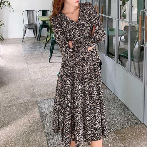 잔플라워 패턴 쉬폰소재 허리밴딩 긴팔 롱원피스 WE1698C
