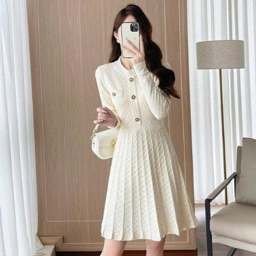 [아리엘스타일]엠보니트원피스 골드버튼 플레어니트 플루라원피스