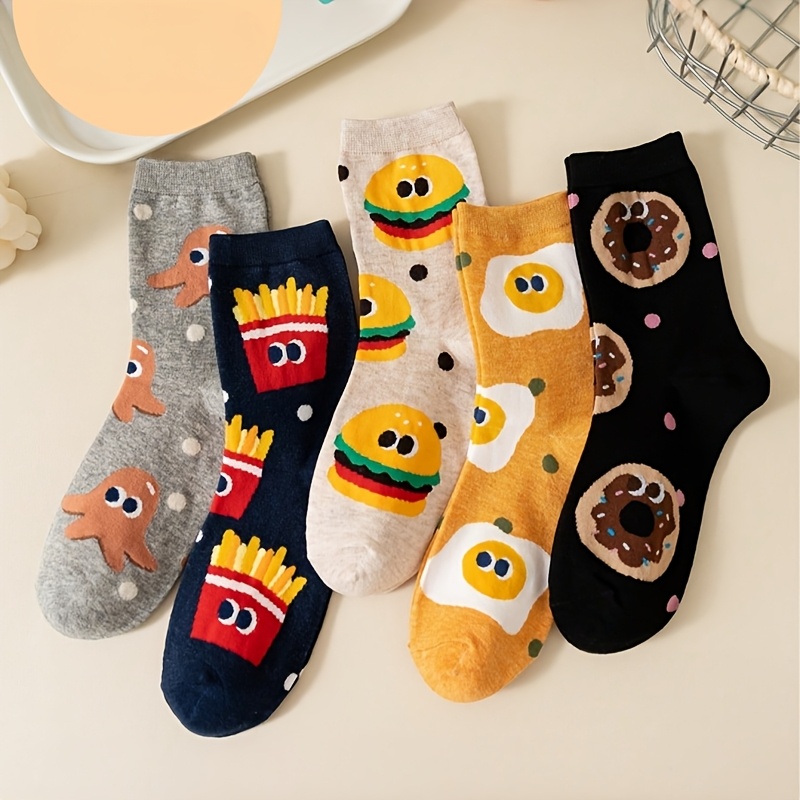 TEMU 여성을 위한 재미있는 스낵 패턴의 스타일리시하고 편안한 미드-카프 양말 5켤레