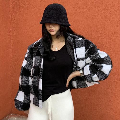 [다잇템]여자 양털 울 퀼팅 폴라넥 격자 셔켓 벌룬 자켓