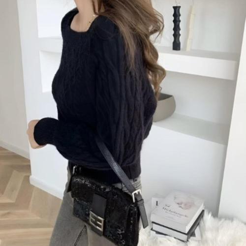 [옷자락]여성 벌룬 소매 스퀘어 넥 케이블 니트 풀오버