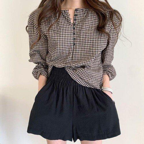 [블로썸스틸]벌룬 소매 라운드넥 체크 블라우스
