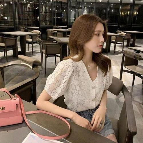 [셀러허브_여성트랜드패션]여자 꽃무늬 V넥 레이스 벌룬소매 블라우스