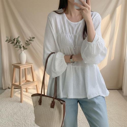 [셀러허브_여성트랜드패션]여자 벌룬소매 잔주름 드로우코드 U넥 블라우스