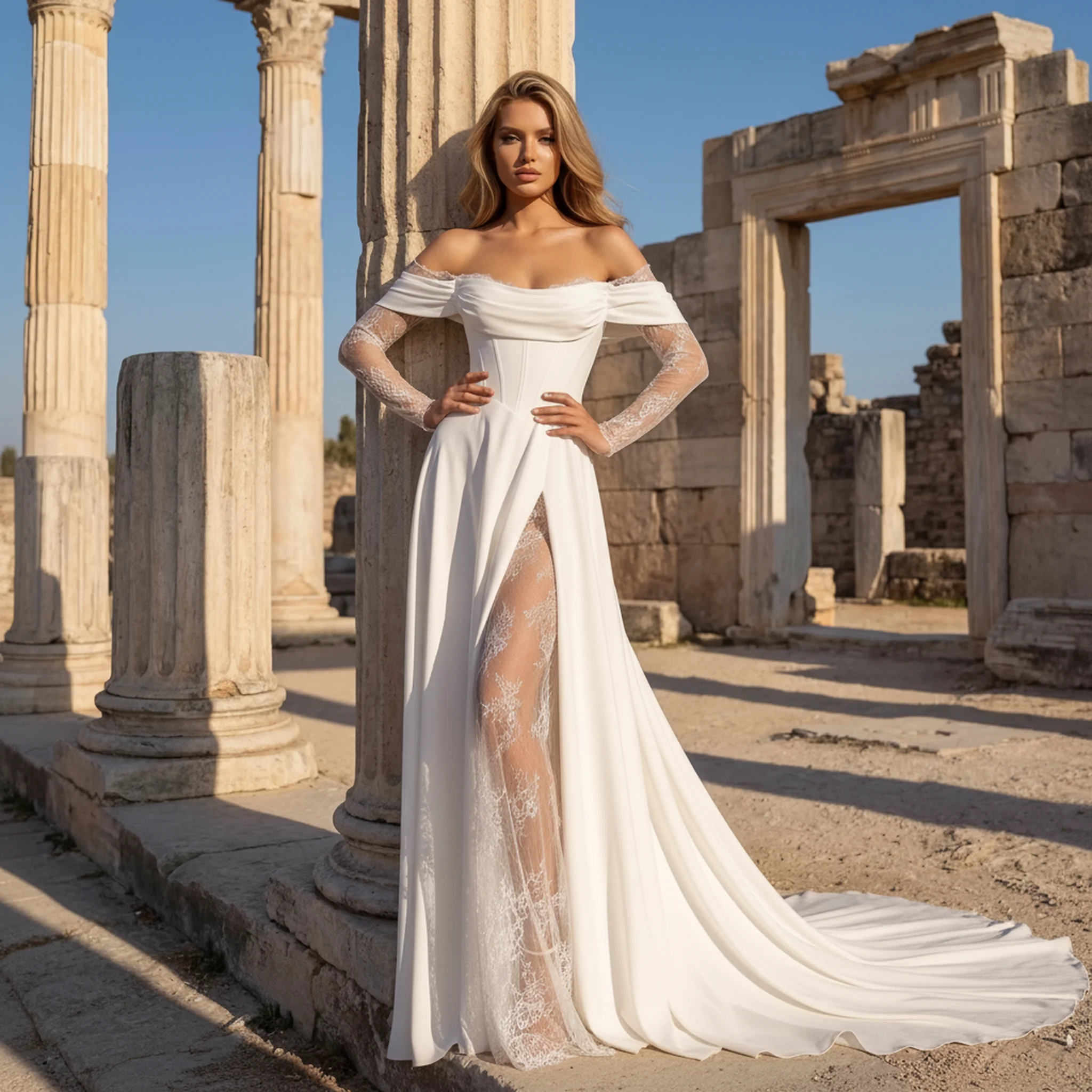 우아한 새틴 오프숄더 웨딩드레스 롱 볼 가운 트레인 포함 2025 베스티도 노비아 슬릿 레이스 브라이덜 가운 여성용