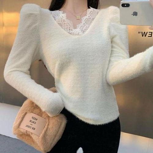 [셀럽하우스]소매 UJHE1134 넥라인 레이스 브이넥 앙고라 블라우스