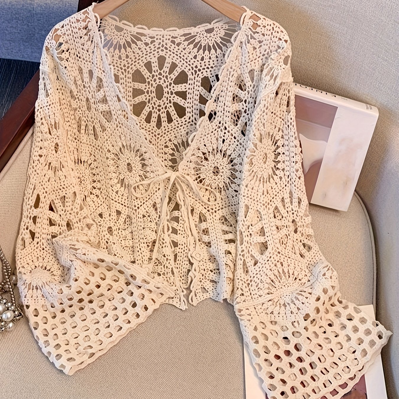 TEMU 스타일 홀로우 아웃 자수 가디건 패션 블라우스