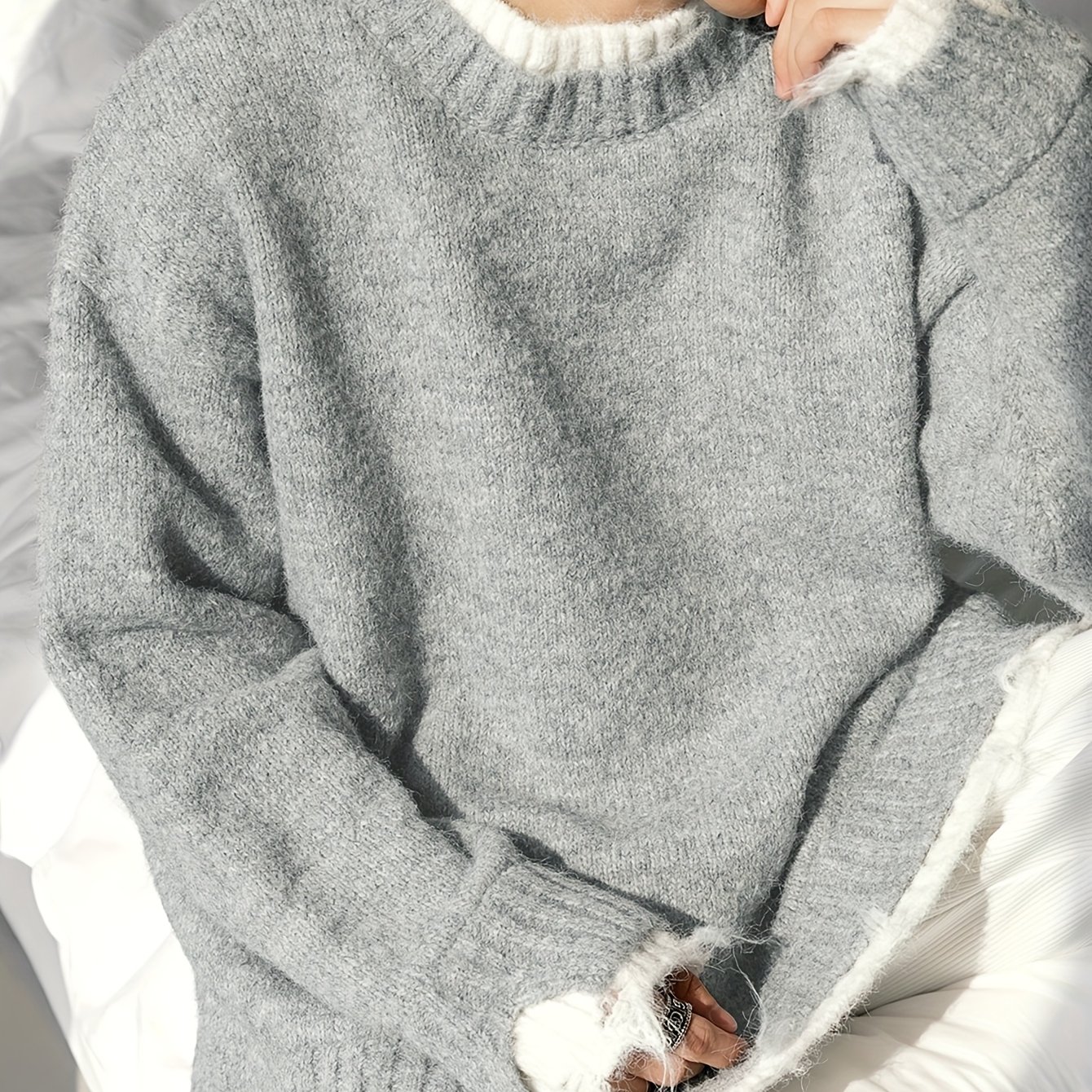 TEMU 2025 신상 여성용 루즈핏 페어리 스타일 패치워크 헤어니들 스웨터, 라운드넥, 스타일리시 러플 트림, 반짝이는 긴 소매, 다용도 봄 상의, 여성 아름다운 의류, 데일리웨어로 젊어 보이는 아이템