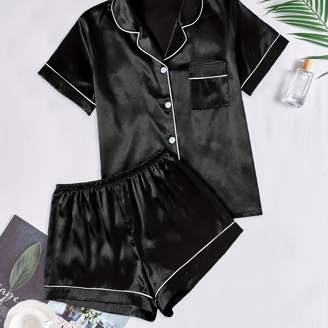 TEMU 청년적인 우아한 파자마 세트 - 단추가 있는 반팔 상의 및 포켓이 있는 반바지, 단색, 모든 계절에 편안한 잠옷, 캐주얼한 잠옷|반팔 상의|포켓이 있는 상의