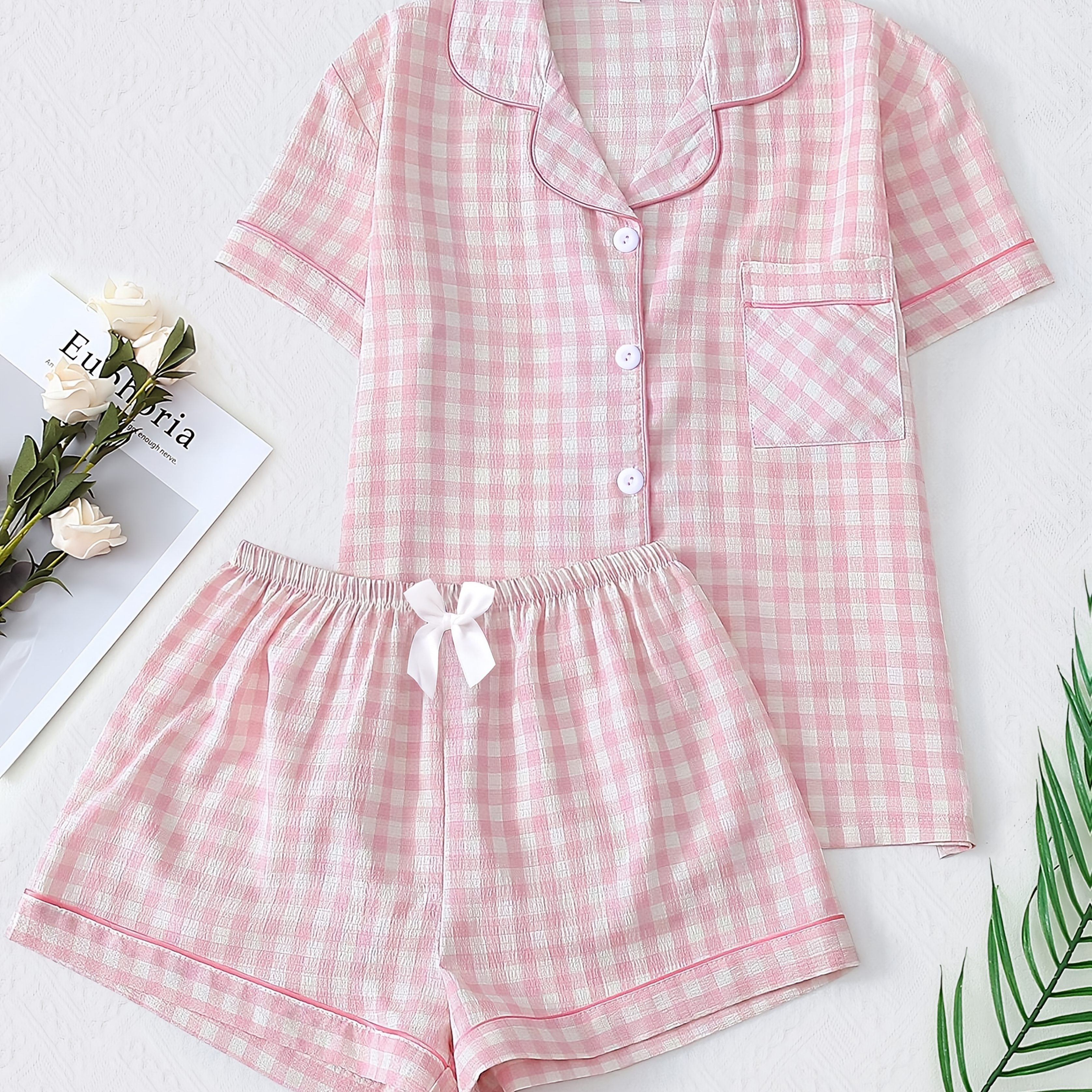 TEMU 플라이트 프린트 여성 파자마 세트, 여름용 반팔 & 숏팬츠 홈웨어, 가벼운 편안한 체크무늬 라운드웨어