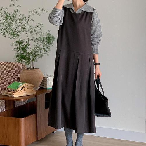 [신상오픈런]여성용 브이넥 울 니트 롱원피스 뒷오프닝 봄 모임룩 (32328894)