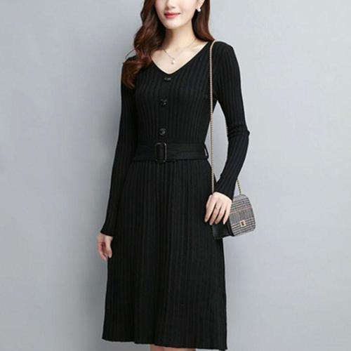 여성용 브이넥 니트 원피스 봄 가을 겨울 긴팔 슬림핏 하객룩 롱원피스