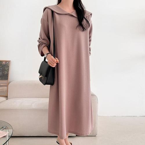 더시럽 여성용 기본 단색 슬림 긴팔 롱 원피스