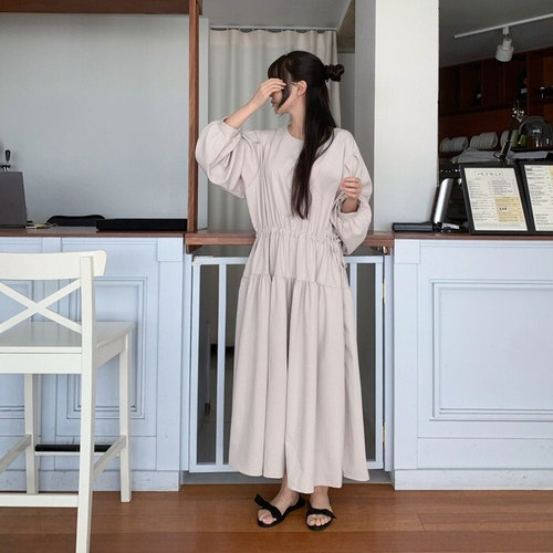 플러리싱 / 봄신상 허리 스트링 벌룬 소매 롱 원피스 플러리싱