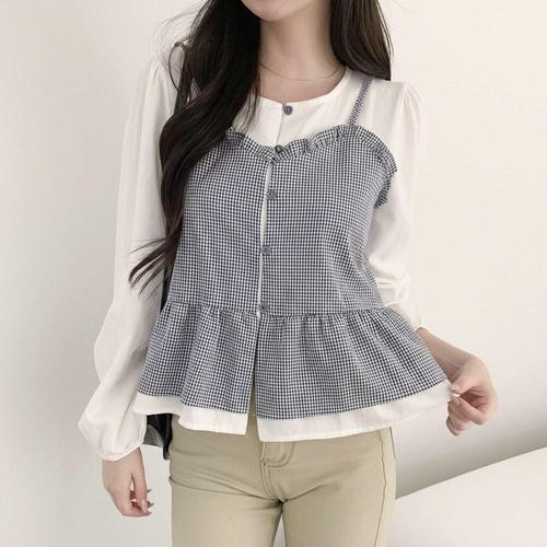 [미라클세븐]여성 체크 패턴 페플럼 뷔스티에 레이어드 블라우스